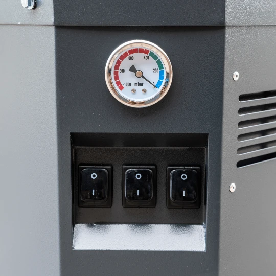 Trzy przełączniki i manometr zapewniają pełną kontrolę nad pracą odkurzacza.