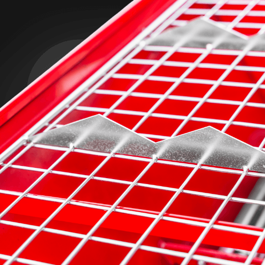 Specjalna krata z gęstymi otworami zapewnia bardzo równomierne rozsypywanie posypki betonowej. Dzięki temu powierzchnia posadzki ma jednolitą strukturę i lepszą jakość wykończenia.