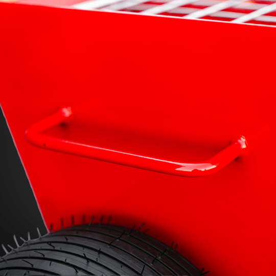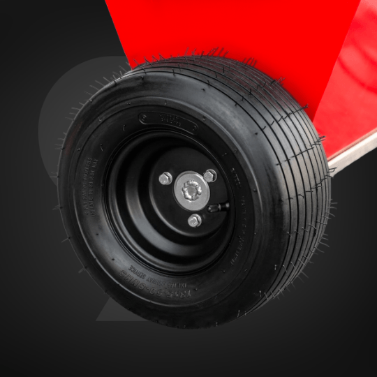 Grube opony pompowane (13×6,5×6) zapewniają delikatny kontakt z podłożem. Wózek nie zostawia śladów na świeżej posadzce i dobrze prowadzi się także po trawie.